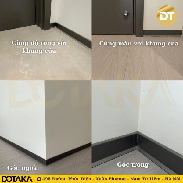 Cả hai loại đều có tại Dotaka.vn – Len nhôm chân tường dán trực tiếp với màu sắc đa dạng: trắng cát, đen mờ, xám sâm panh, dễ phối với nội thất.